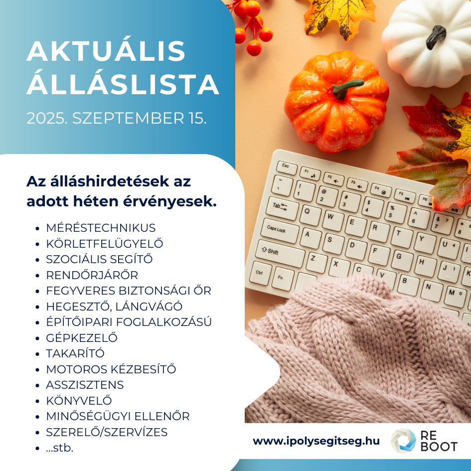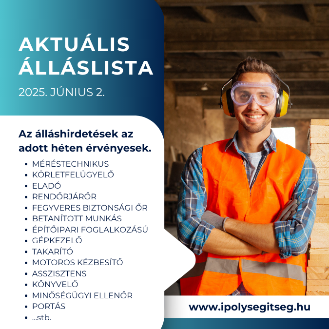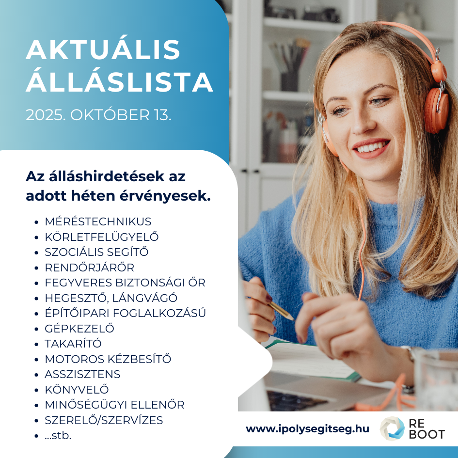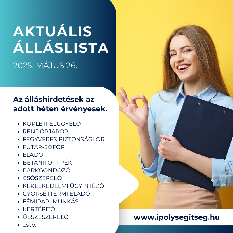 Az álláshirdetésekaz aktuális héten érvényesek. Tekintse meg az aktuális álláslistát az alább letölthető dokumentumban!
