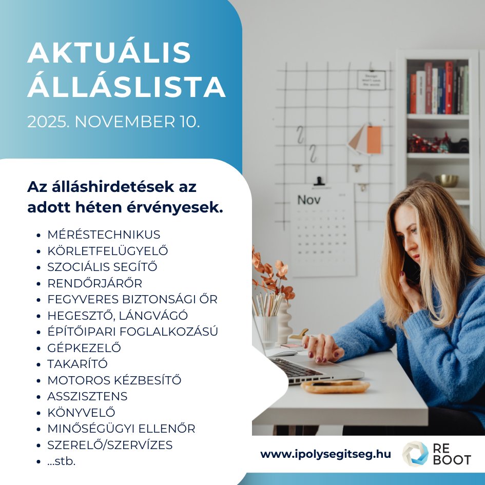 Az álláshirdetések az adott héten érvényesek. Tekintse meg az aktuális álláslistánkat az alább letölthető dokumentumban!