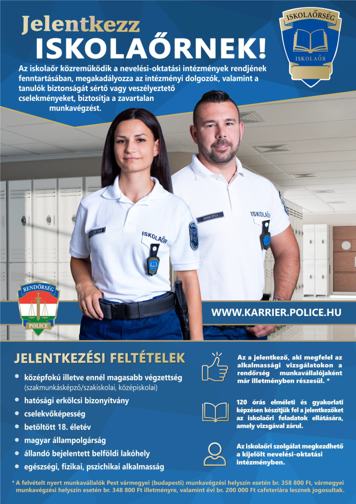 Az iskolaőr közreműködik a nevelési-oktatási intézmények rendjének fenntartásában, megakadályozza az intézményi dolgozók, valamint a tanulók biztonságát sértő vagy veszélyeztető cselekményeket, biztosítja a zavartalan munkavégzést. Jelentkezési feltételek: középfokú végzettség (minimum érettségi); büntetlen előélet; cselekvőképesség; betöltött 18. életév; magyar állampolgárság; állandó bejelentett belföldi lakóhely; egészségi alkalmasság. További információk és jelentkezés: www.karrier.police.hu