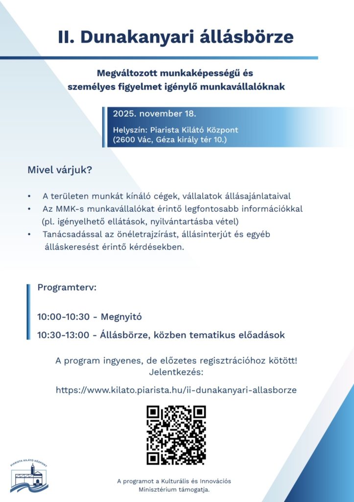 Megváltozott munkaképességű és személyes figyelmet igénylő munkavállalóknak. Helyszín: Piarista Kilátó Központ (2600 Vác, Géza király tér 10.) 2025. november 18. A programot a Kulturális és Innovációs Minisztérium támogatja. Mivel várjuk? • A területen munkát kínáló cégek, vállalatok állásajánlataival • Az MMK-s munkavállalókat érintő legfontosabb információkkal (pl. igényelhető ellátások, nyilvántartásba vétel) • Tanácsadással az önéletrajzírást, állásinterjút és egyéb álláskeresést érintő kérdésekben. Programterv: 10:00-10:30 - Megnyitó 10:30-13:00 - Állásbörze, közben tematikus előadások A program ingyenes, de előzetes regisztrációhoz kötött! Jelentkezés: https://www.kilato.piarista.hu/ii-dunakanyari-allasborze